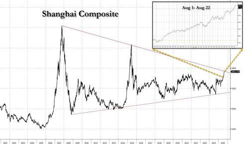 Shanghai ( SHCOMP) isn’t just rallying — it’s tearing down the track with afterburners on, leaving cautious hands choking in the dust. This isn’t your garden-variety grind higher; it’s the kind of upside mania where gravity feels optional, and prices hang in the air far longer than skeptics think possible. Overbought doesn’t mean over — it means the tape has gone weightless, and anyone betting against it risks getting torched.