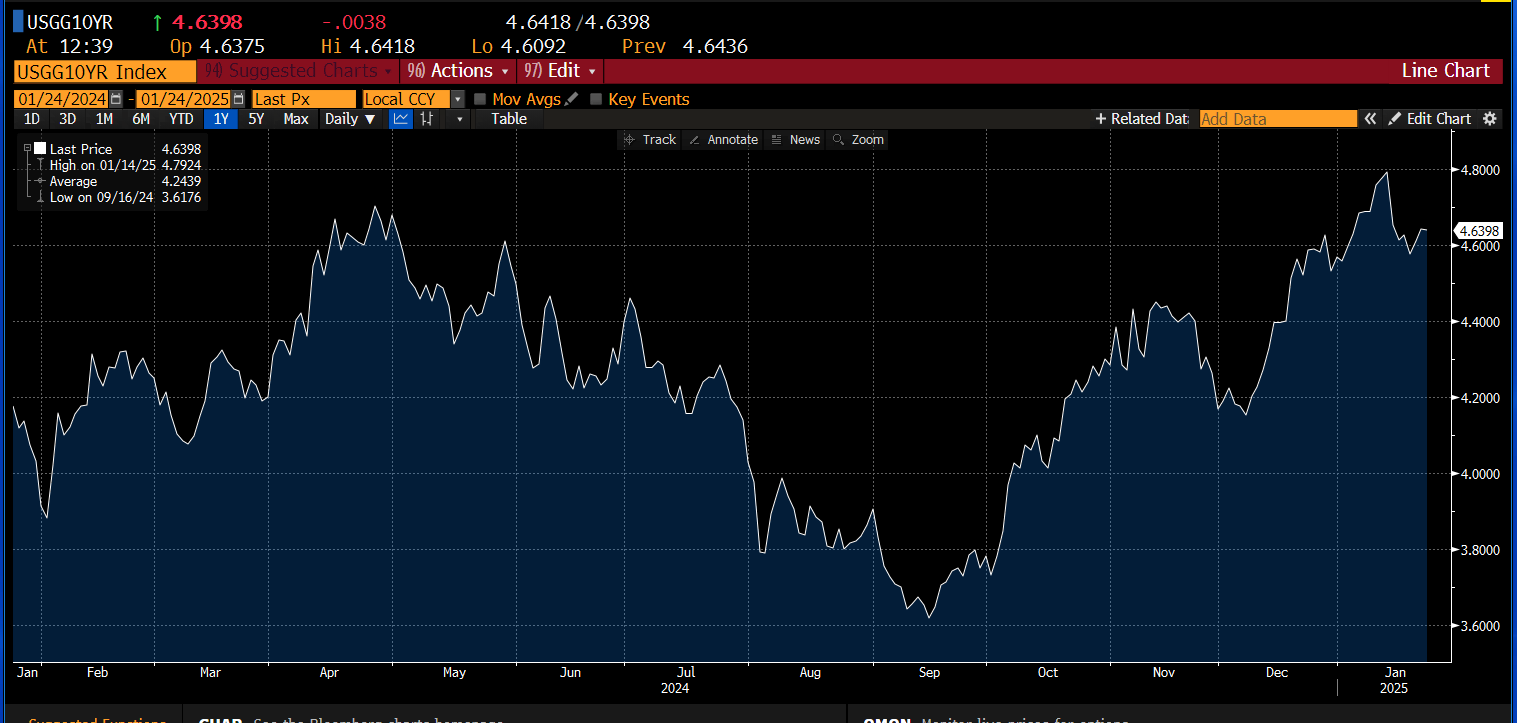 Another feature of his Presidency so far has been a resilient bond market. 10-year yields are lower by 16 basis points since mid-January and have backed away from highs of 4.8%. This suggests two things: 1, some bond investors may think that Trump could have a disinflationary impact on the US economy, and 2, investors are taking a pragmatic approach to Trump 2.0.
