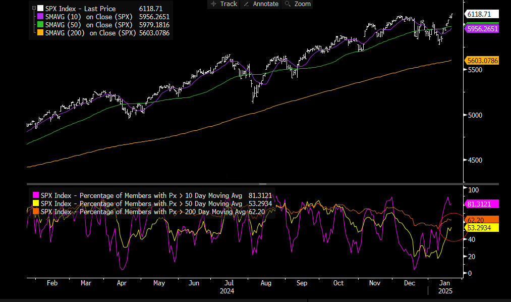 60% of S&P 500 stocks are now above their200-day sma, compared with 45% of stocks on the Nasdaq, which is a sign that tech’s dominance could face a challenge this year. As you can see, the percentage of companies above their 200-day sma has been rising along with the Trump trade. Thus, a big part of the Trump trade so far has been a broadening out of the stock market rally.