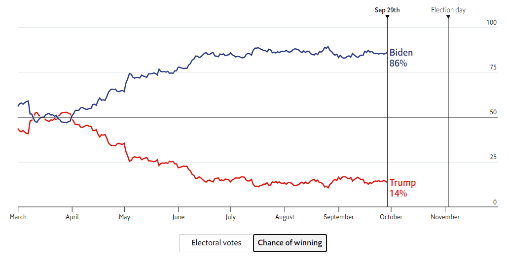 Biden has an 86% chance of winning as of September 29, according to The Economist's model.