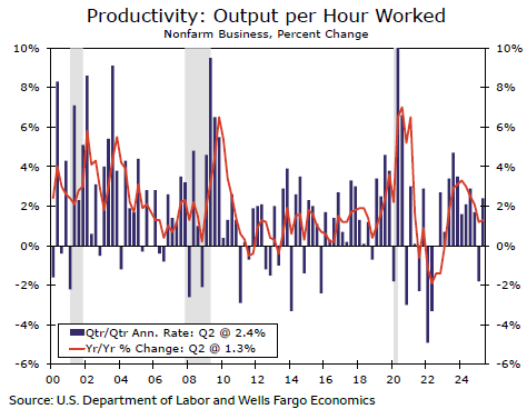 Smoothing with a four-quarter moving average, nonfarm labor productivity is up 1.8% year-over-year (chart). This pace matches its average annualized increase since the end of 2019 and is notably stronger than the past cycle's average of 1.5%. With workers more productive, firms have generally enjoyed increased profitability and employees have seen real earnings growth. Solid productivity growth also provides firms the flexibility to absorb higher costs of production without needing to mark up their selling prices to the same degree, which could help to counterbalance the inflationary impulse from tariff-related price pressures today.
