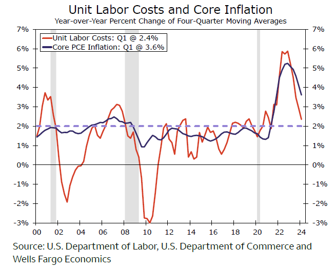 The latest productivity report is not as discouraging as viewing the quarterly prints in isolation would suggest. Slower growth in Q1 paired with a pickup in hiring and hours worked led productivity growth to nearly stall in Q1 (+0.3% annualized), while unit labor costs (ULCs) strengthened to a 4.7% annualized rate. However, the unfavorable outturns for both productivity and ULCs are reminiscent of the first quarter of 2022 and 2023, hinting at some difficulty in fully accounting for seasonality in the data.