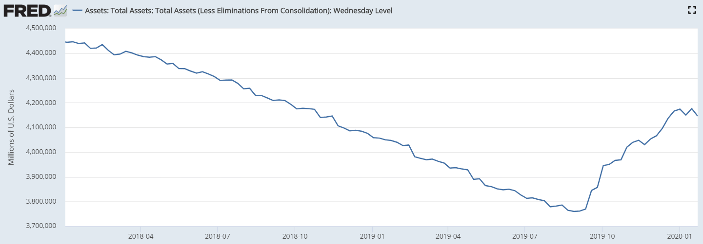 On that date, the Federal Reserve announced that it would be conducting a series of “purely technical” repurchase agreements “to ensure that reserves remain ample” in the financial system. These twice- or thrice-weekly $35B+ injections of liquidity have continued since in a process that traders have sarcastically dubbed “Not Quantitative Easing.” Over this period, the Fed’s balance sheet has grown by nearly $4T, unwinding about half of the “Quantitative Tightening” decrease since the start of 2018: