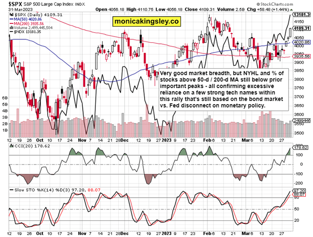 The rally is of course heavily dependent on the sectors I talked often recently – tech, semiconductors and communications. The dependance on heavyweights is all too palpable, and the flagging broader participation would come to bite, but not yet. Let NVDA, META, AMD and TSLA do the job for now. They are the generals that would be left standing while the troops at a future point refuse to participate in the upswing (not immediately on the horizon).