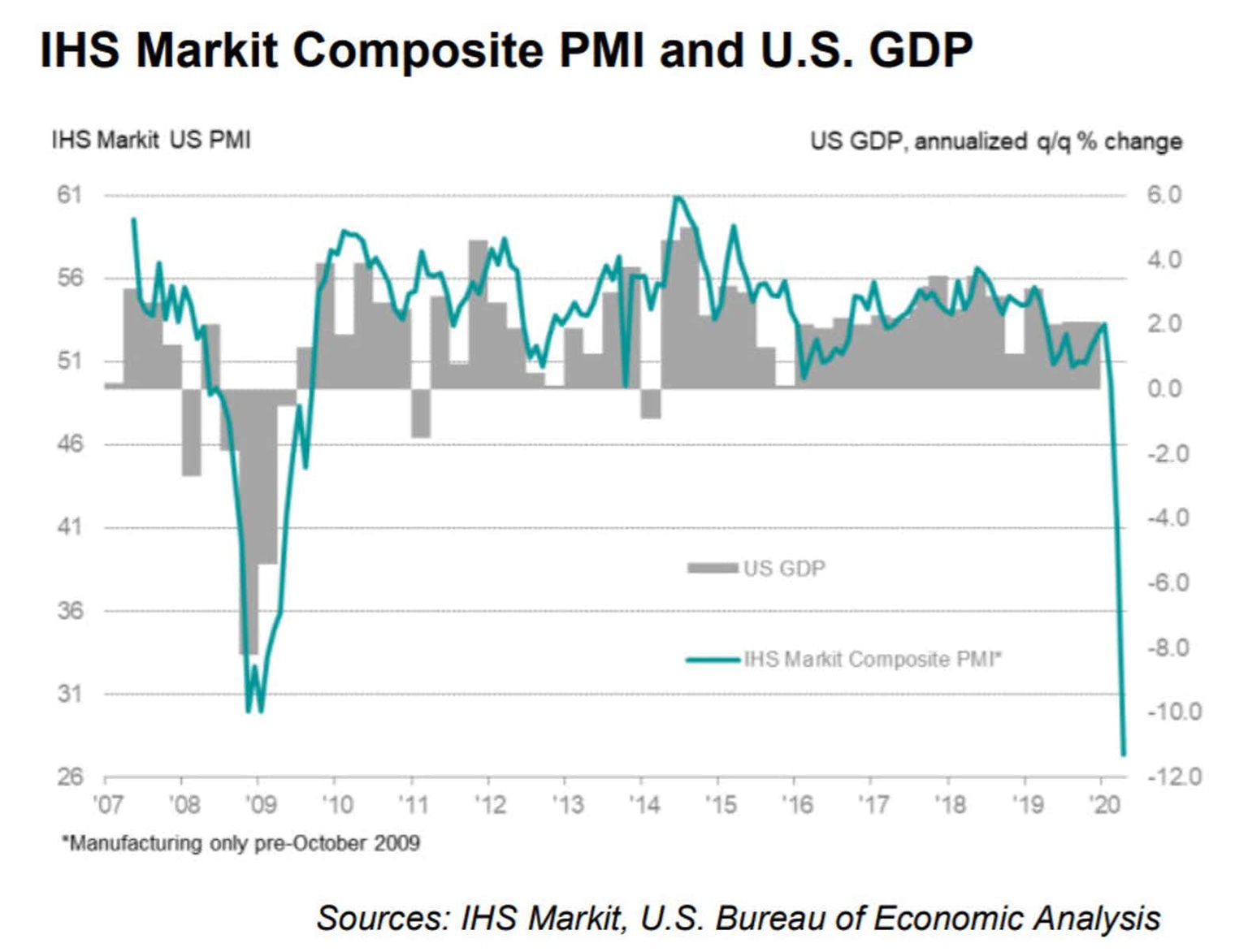 - “The COVID-19 outbreak dealt a blow to the US economy of a ferocity not previously seen in recent history during April. The deterioration in the flash PMI numbers indicates a rate of contraction exceeding that seen even at the height of the global financial crisis, with jobs also being slashed at a rate far exceeding anything previously recorded by the survey.”
