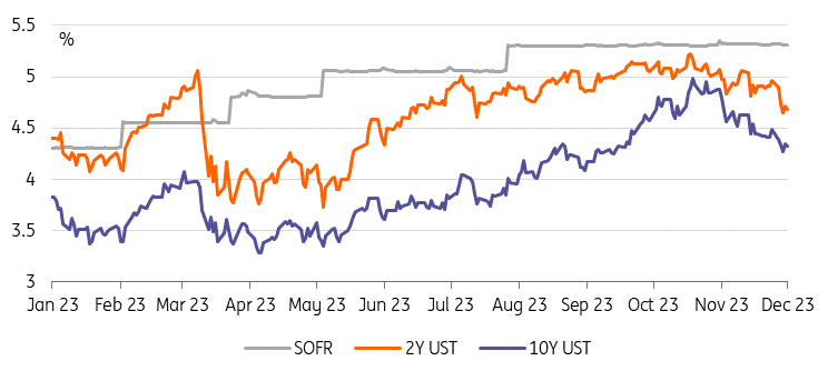 Even as yields have managed to do some ratcheting higher, curve steepening continues (dis-inversion). According to the Fed’s term premium model, there is a term 'discount' of 25bp in the US 2yr, which suggests that it is rich by 25bp versus what’s discounted for rate expectations in the next two years. However, we’d argue that the current rate discount will deepen further once we get to the point where the Fed is actually cutting rates. That leaves us comfortable with the 2yr yield maintaining an implied discount to future rate expectations. That said, for players that believe in the higher-for-longer narrative, then the 2yr yield is too low, by at least 25bp (not our view).