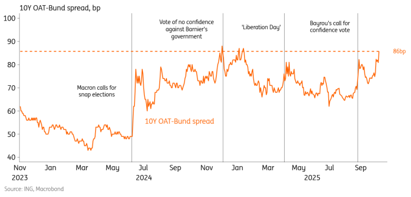 The spread of 10y French government bonds over German Bunds stood some 5bp wider at around 86bp by the end of Monday, following the news of Prime Minister Lecornu’s resignation.