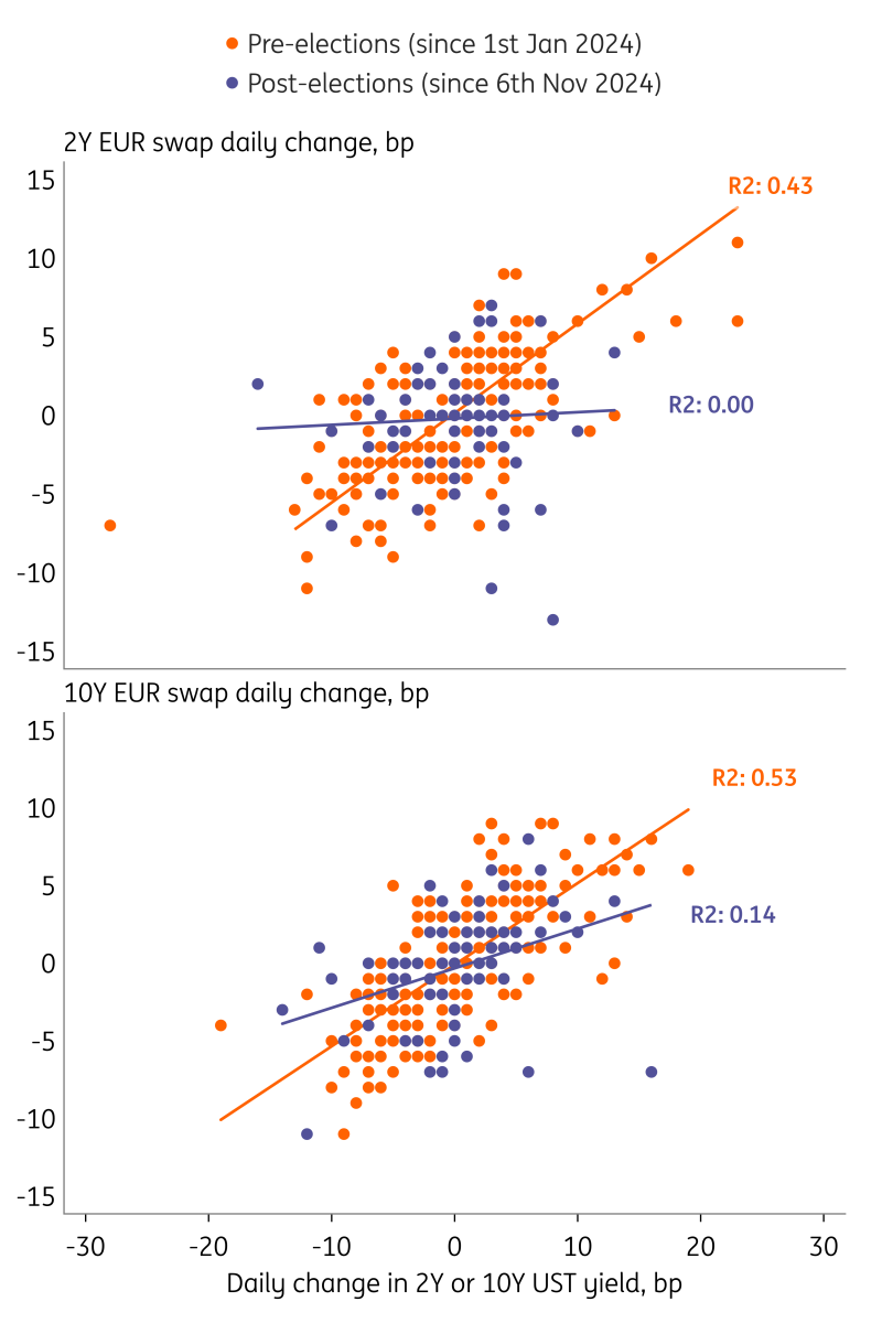 When looking at the entire period since Trump’s election, the correlation between daily changes of the 2Y euro swap rates and 2Y UST yields actually fell to zero (see figure below). Further out the curve we also see that USTs have less spillovers than earlier in 2024. Before the elections in November, more than 50% of the daily variation in 10Y euro swap rates could be explained by changes in the UST yields. This is reduced to 14% since. Besides tariff threats there were other factors in play here, including the more downbeat data releases in the eurozone compared to the US.