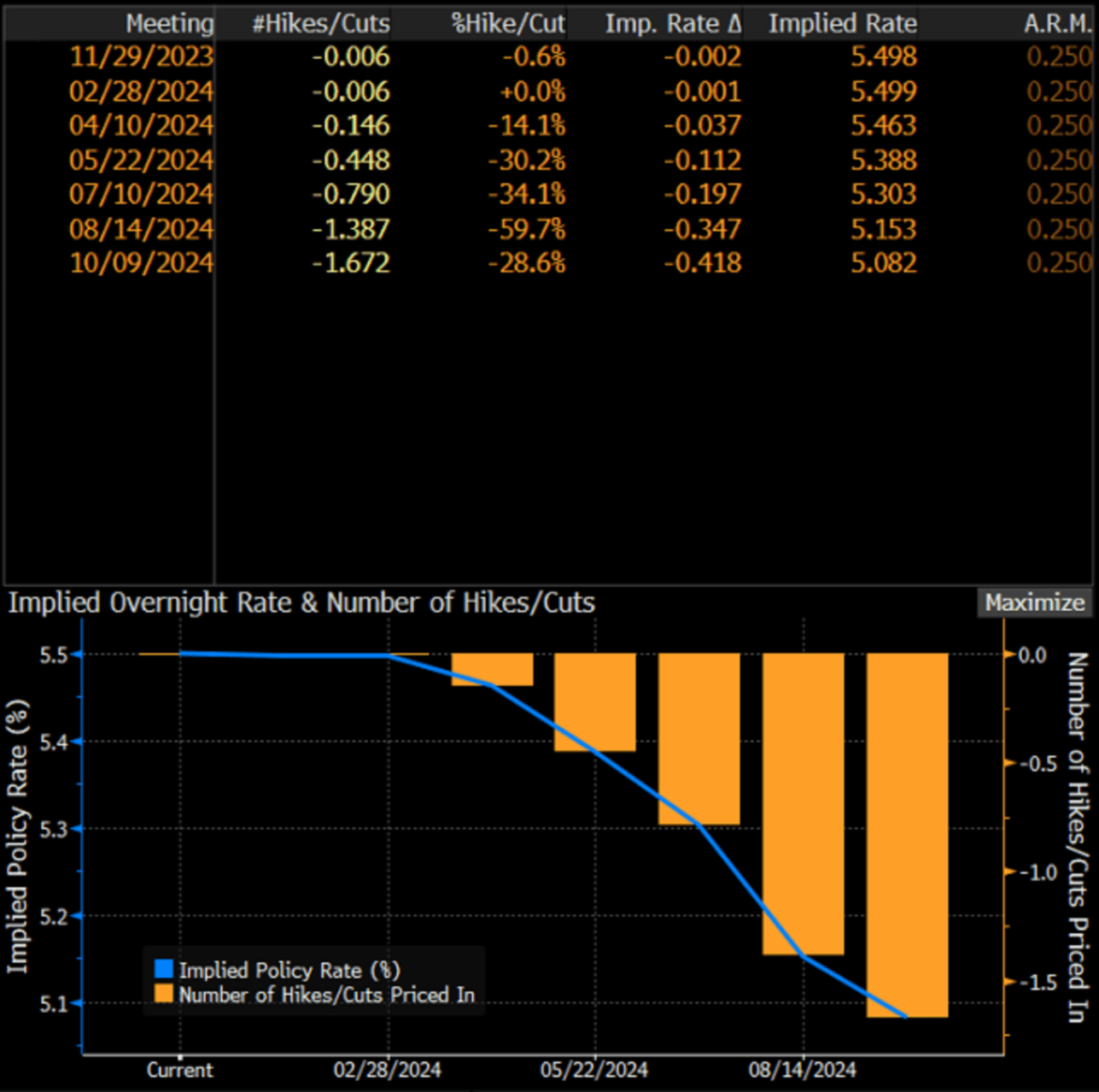 As you can see from the image below, the implied probability for tomorrow’s meeting is for the OCR to remain unchanged with one 25bp rate cut currently priced in by around mid-2024. All 21 economists surveyed by BBG and all 28 economists surveyed by Reuters unanimously forecast that the central bank will hold the line. Consequently, market focus will be directed to the post-rate statement, with market participants monitoring for any language change, particularly regarding the outlook for rate cuts. RBNZ Governor Adrian Orr will also take the stage at the post-meeting press conference an hour later (3:00 pm GMT).