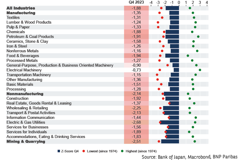 Beyond the risk this poses to economic growth, it remains to be seen whether these tensions on the labour market will finally lead to a turning point in terms of wage growth in 2024. The latter did not really gain momentum in 2023, even as inflation heightened in the country and corporate profits and margins reached record levels last year.