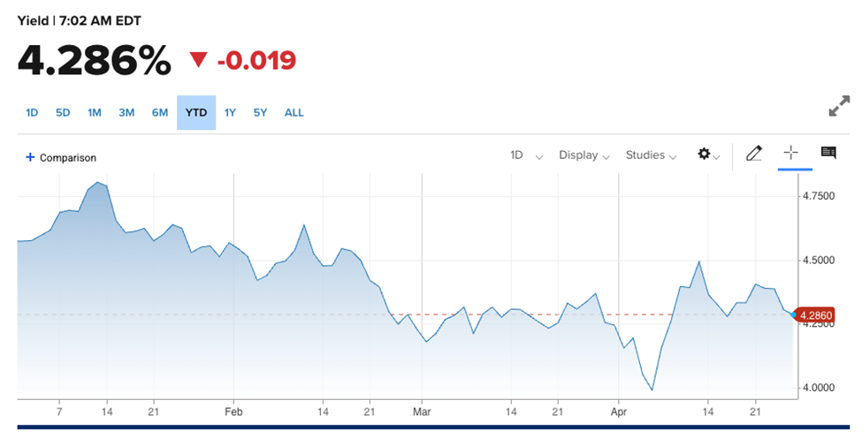 During the week of April 7, the 10-year treasury yield increased by a full half-percent, the biggest weekly rise since 2001. On April 10, the 10-year yield drove above 4.5 percent and closed at 4.49 percent.