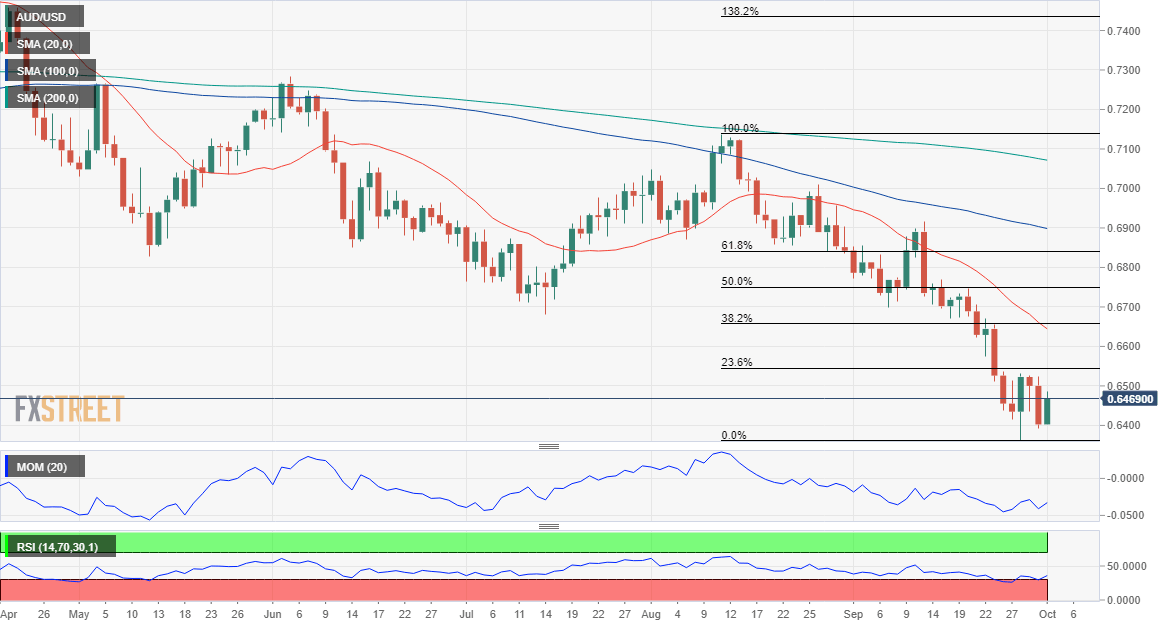 The pair set a 2022 low at 0.6363 last week and is currently battling with the 23.6% Fibonacci retracement of its daily slump measured between 0.6915 and the aforementioned low, at 0.6490. The advance seems corrective, according to technical readings in the daily chart, amid the extreme overbought conditions of the greenback.
