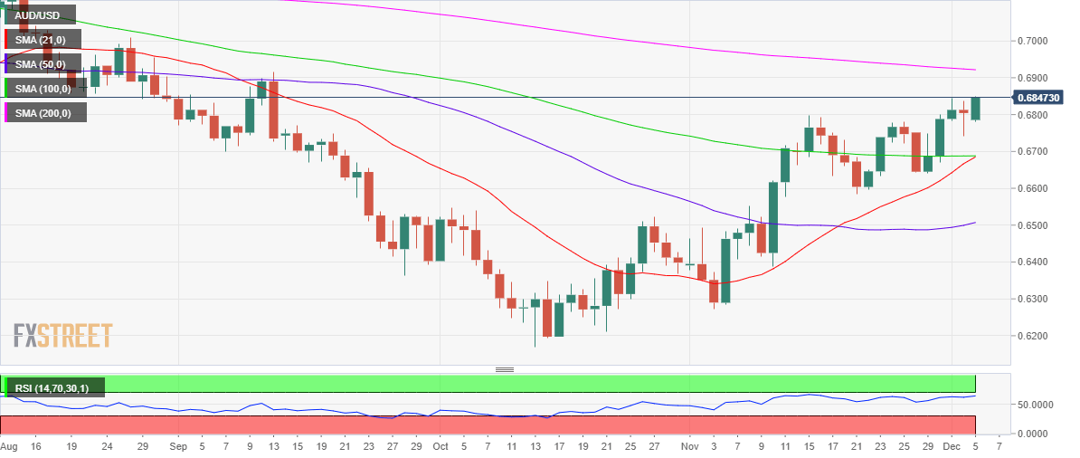 AUD/USD is sitting at the best levels seen since September near 0.6850 as we head toward Tuesday’s RBA policy announcements. Dovish Fed outlook and China’s reopening optimism have fuelled the latest uptrend in the Aussie pair.