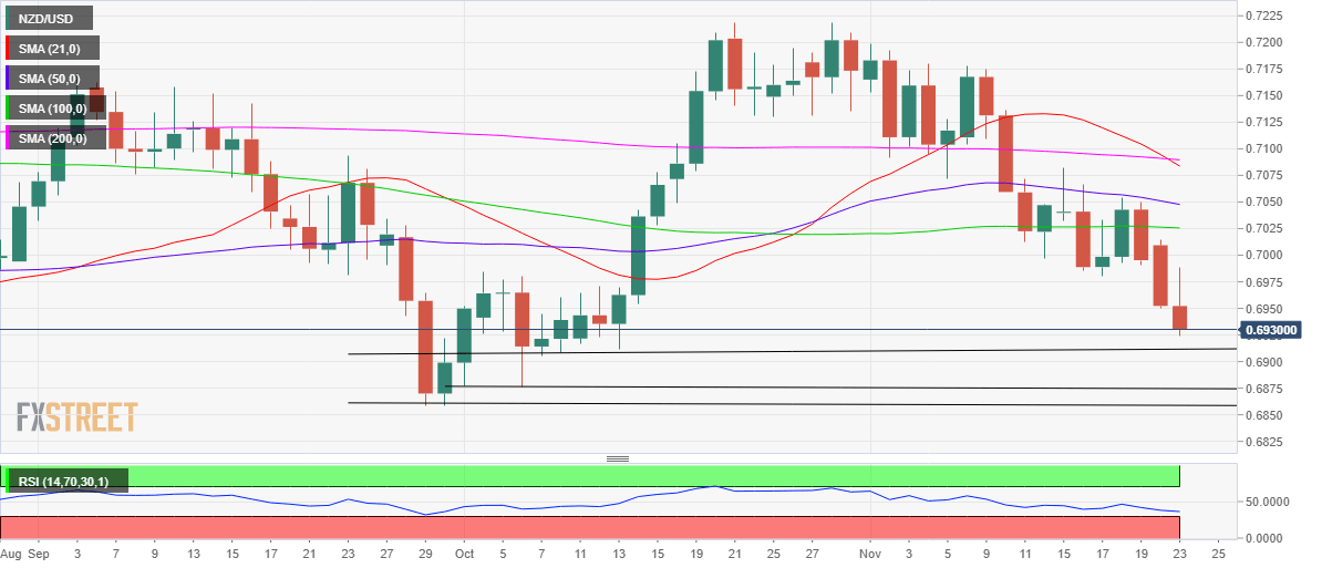 NZD/USD is languishing at multi-week lows, threatening the 0.6900 level ahead of the Reserve Bank of New Zealand (RBNZ) showdown on Wednesday. The South Pacific Island nation is set for its second consecutive interest rate hike to combat rising inflationary pressures, as the economy gradually emerges from Delta covid variant outbreak-led lockdown measures.