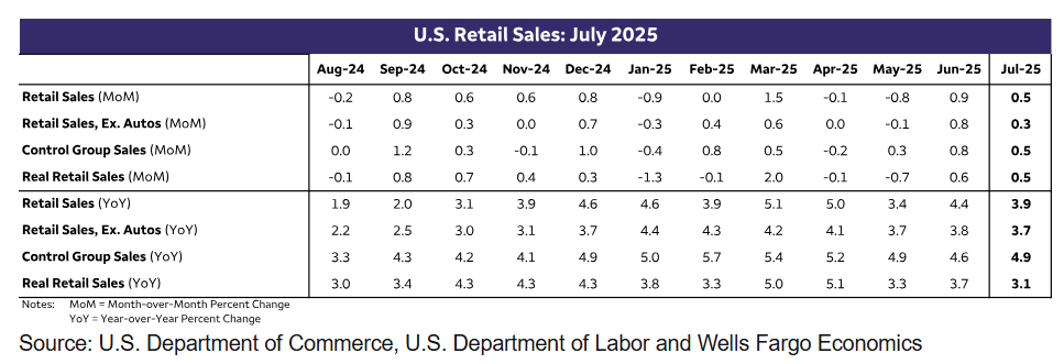 Retail sales were stronger than anticipated in July. Not only were overall sales up 0.5% during the month, but upward revisions to June activity suggest the consumer is on slightly firmer footing headed into Q3. We are still cautious on the trajectory of spending in the second half amid a moderating jobs market and concerns over higher prices.