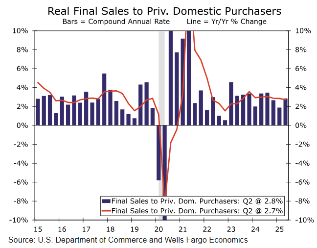 Ultimately the updated GDP figures suggest the U.S. economy was undeniably resilient in the first half of the year despite the on-again off-again approach to U.S. trade policy. The monthly data also suggest growth continued to run at a decent clip into the third quarter. The durable goods shipments data suggests a slower but still positive pace of equipment investment in Q3. While core nondefense capital goods shipments (excluding aircraft) slipped 0.3% in August, this measure has trended higher on a year-ago basis. The advance goods trade balance data also out this morning suggests net exports will be more of a neutral force on Q3 growth after the whipsaw effects in the first half of the year. Tomorrow's personal income & spending report for August will be key in assessing near-term consumer momentum.