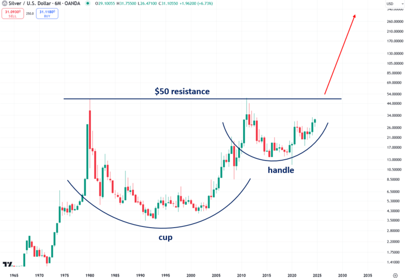 If we look at a 50-year price chart for silver, we see a very distinctive pattern known as a “secular cup and handle.”