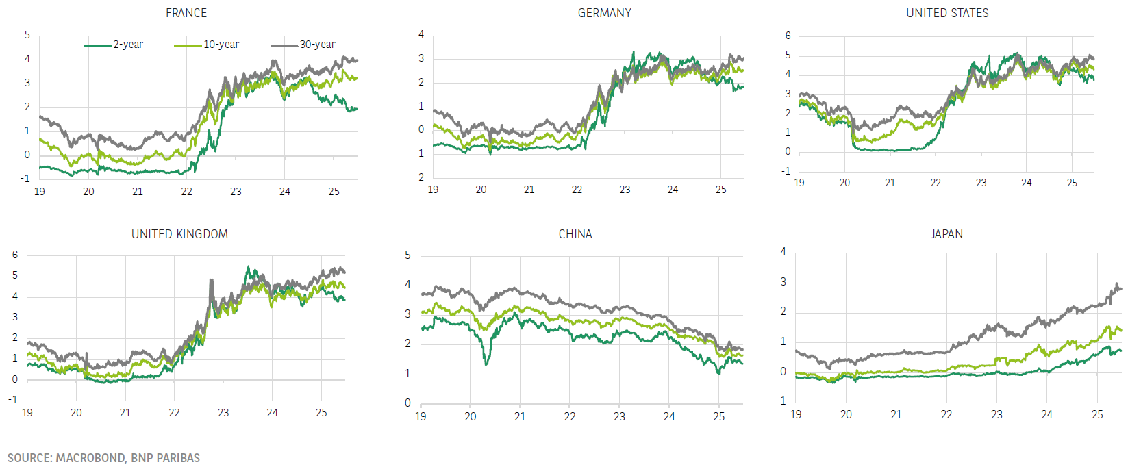 Yields have been rising across the board, especially as maturities lengthen. Monetary policy is playing a role on all parts of the curve, with the gradual tightening of monetary policy, while the BoJ is gradually reducing its rate of securities purchases, projecting a halving between Q1 2024 and 2027 (to JPY 2.1 trn per month). At the same time, the stagflationary economic situation and the lack of any prospect of fiscal consolidation are not helping. As a result, the spread between the 10-year and the 30-year has reached an all-time high, a sign of deep-rooted concern over Japanese debt.