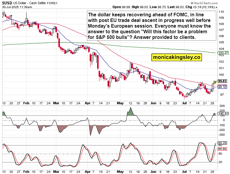 S&P 500 tried to push higher, led by tech (which was the area that brought clients‘ very short-term gains yesterday), alongside the dollar that continued consolidating with a bullish bias. The key question brought up in the below caption (and what kind of sectoral consequences that can have). Get ready for META and MSFT earnings, not just to FOMC that would be mainly about the conference pronouncements.