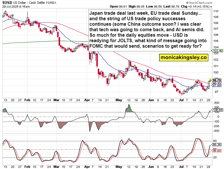 S&P 500 pushed a bit higher following the bullish opening gap called, and then pulled back not only during the regular session – it pulled back almost all the way till the closing bell. Is the sectoral perspective concerning, the bond market concerning, or is USD upswing standing in the way? Just as I called for tech to come back yesterday, this is part and parcel of market timing calls premium clients are getting, so make the best use of my full, full daily analytics and intraday updates, for not even these brief public articles or short but punchy videos are to be released every single trading day in August – care for clients feat. 1:1 comes foremost (thank you all those of you supporting quality work that's dedicated... to you) !