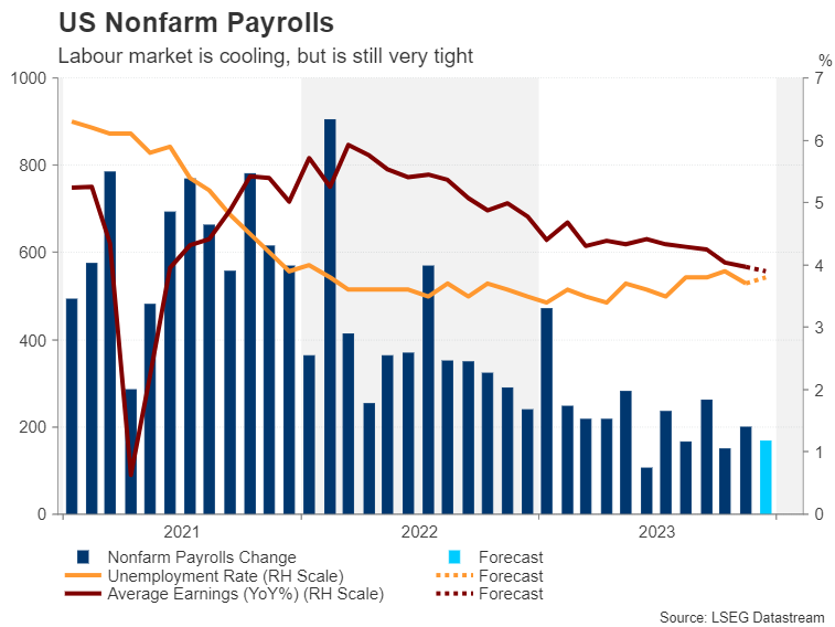 With rate cuts priced in so heavily by investors, a stronger-than-expected NFP report risks roiling markets at a time when some traders have already started to question their overoptimistic view on the Fed rate path. Stock markets have begun 2024 on a negative footing as rate cut bets are being scaled back somewhat, although a flare up in tensions in the Middle East is also contributing to the risk-off mood.