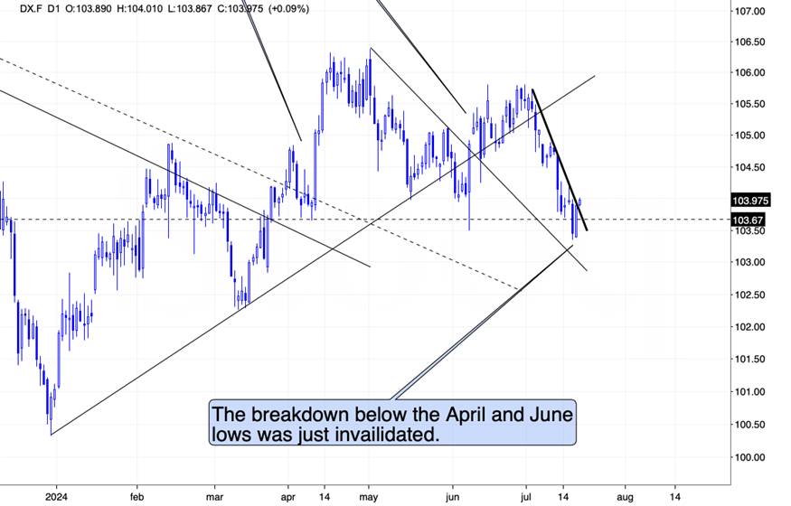 I already wrote that the USD Index invalidated its breakdown below its April and June lows, but now it also moved above its very short-term, declining resistance line. This breakout is not yet confirmed, but we can still say that the outlook for the USDX for the short term has just improved.