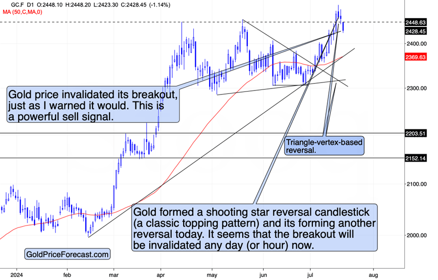 I wrote that given gold’s high-volume shooting star reversal, it was likely to invalidate its recent breakout any day (or hour) now. Quoting my previous comments: