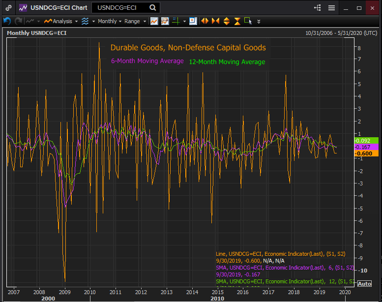 Business investment has been the weak link in the US economy for the last year responsible for most of the drop in GDP. The durable goods category of non-defense capital goods ex-aircraft, an oft used proxy for business investment spending, was negative in both the six-month and 12-month moving averages at -0.167% and -0.092% respectively in September.