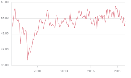 The headline index climbed to 54.7 in October from its three-year low of 52.6 in September. It has been forecast to reach 53.5. Business activity rose to 57.0 from 55.2, also outstripping the 55.0 median prediction. Employment jumped from a five-and a half year low of 50.4 in September to 53.7 and new orders mounted to 55.6 from their 37-month bottom of 53.7.