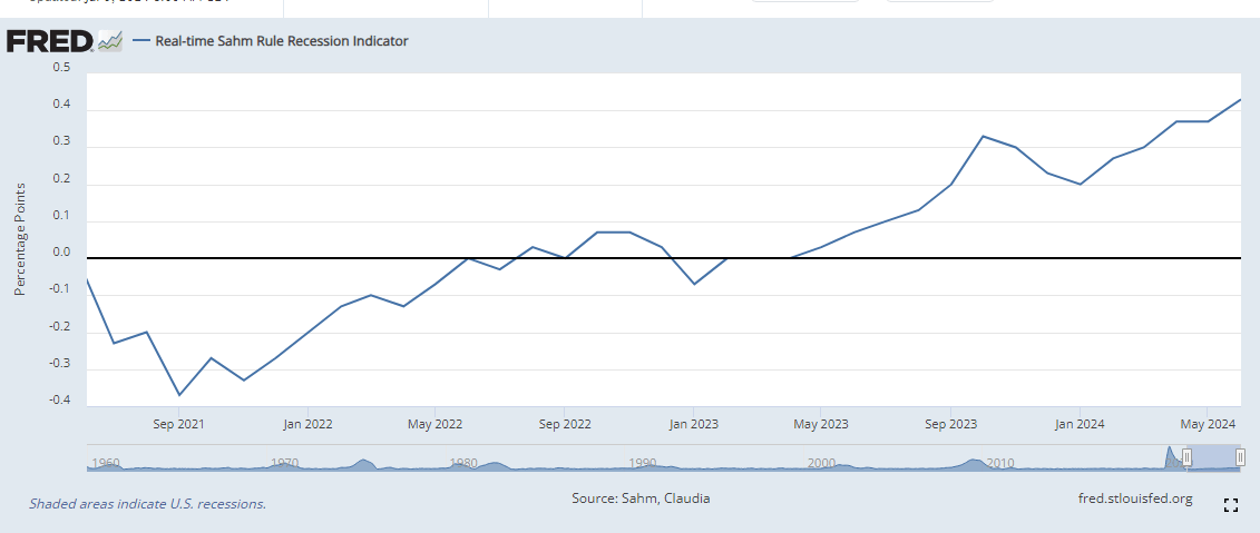 The Sahm Rule indicator stood at 0.43% in June, just below the 0.50% mark.