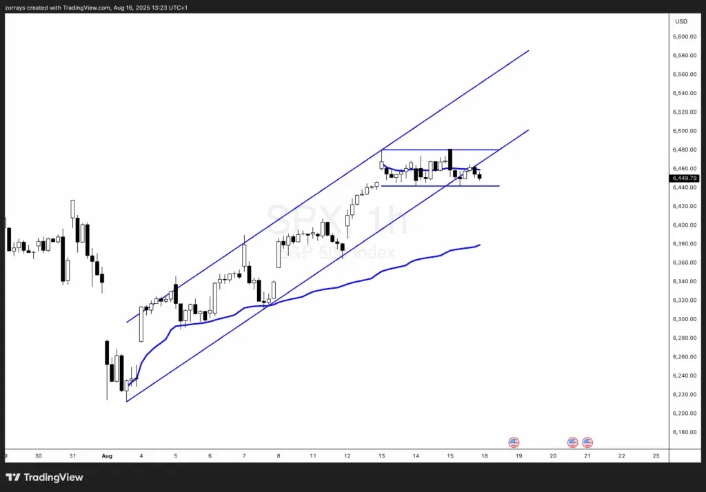The SPX is currently trading within a well-defined ascending channel, respecting both upper and lower bounds since early August. Price recently consolidated into a parallel channel at the upper end—often a bullish flag continuation pattern.
