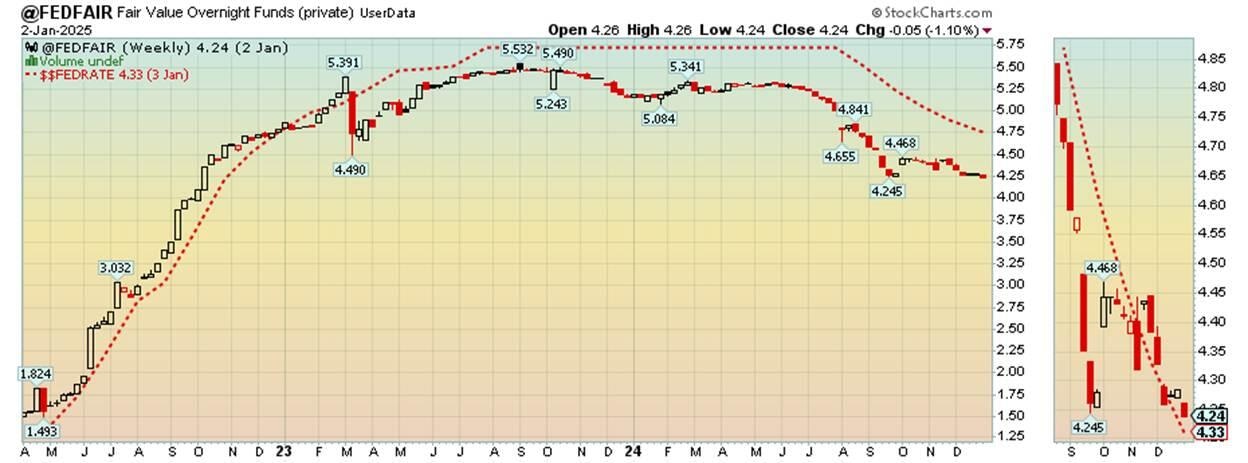 This next chart shows current Fed overnight policy conditions relative to where the market is pricing they should be. The Fed Fair model—one I created years ago—helps monitor when market conditions are likely to be more volatile than normal. When the fair value of the Fed funds target is below the actual target, markets tend to be choppier, and vice versa. As an aside, some of the greatest equity market “crashes,” if you will, have occurred under tight Fed policy according to this model—but that’s a post for another day. In any case, while the market is pricing in an inflation storm via the 10-year yield, the current Fed funds target remains tight, which argues that inflation should continue to moderate. Today’s PCE reading of 2.5%, down from 2.7% a year ago, supports that view.