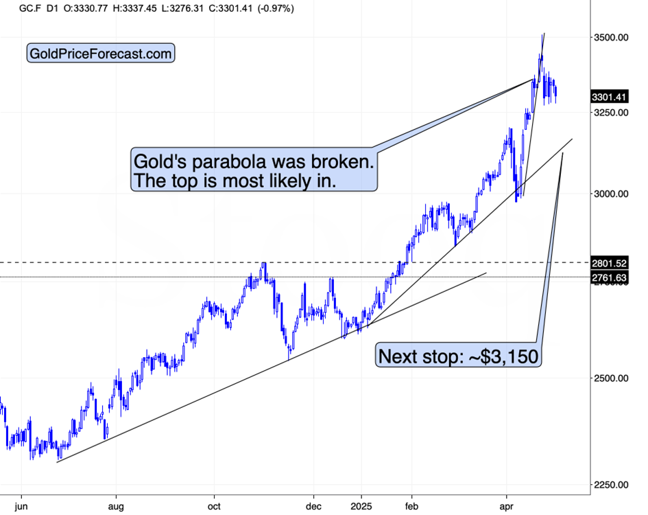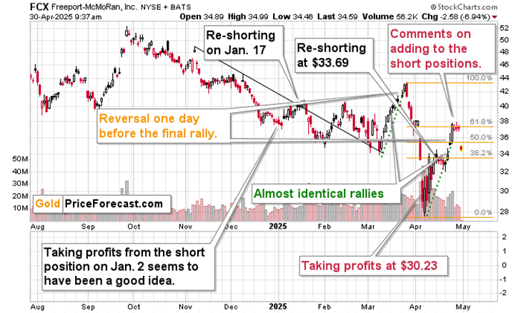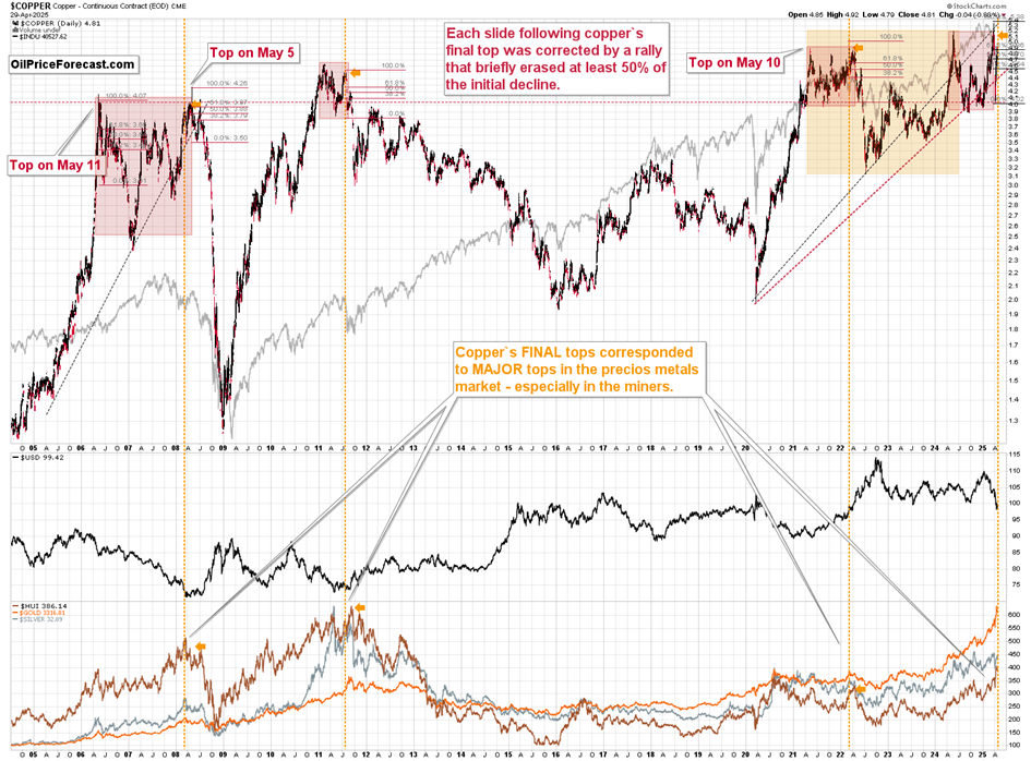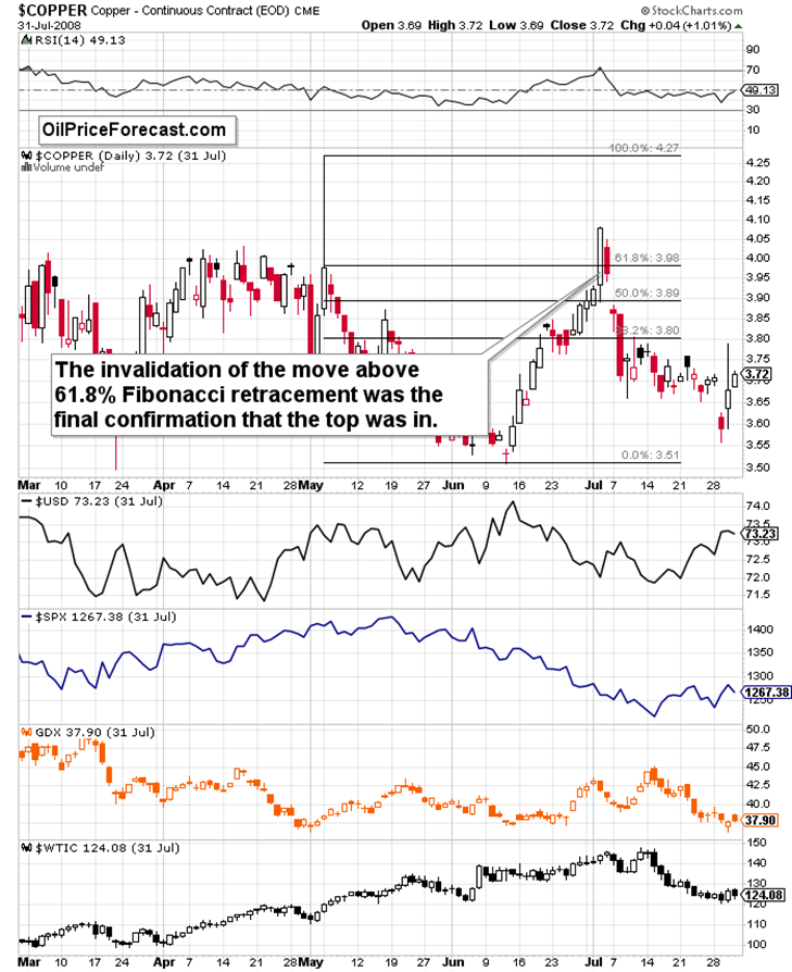 Copper is down by over 6% today, and the U.S. session hasn’t even started yet. The decisive slide back below the 61.8% and 50% retracements sends a clear message: The top is in.