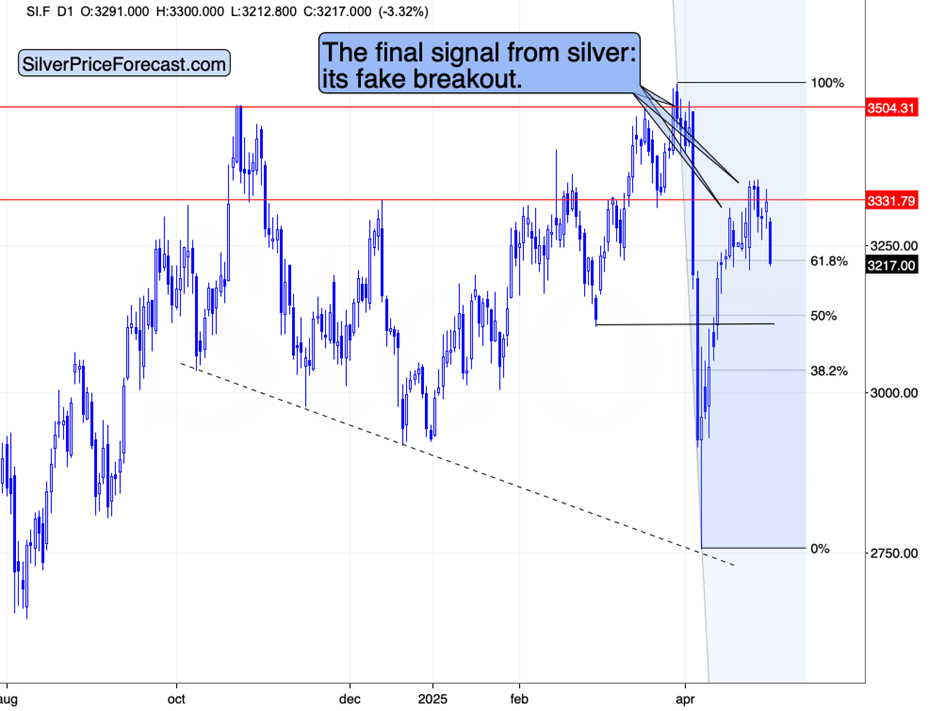 The decline is not as big as it is in case of copper (“only” 3% so far today), but the important thing is that silver already invalidated its moves above the previous highs (red line), and its 61.8% Fibonacci retracement level (just insignificantly, but still).