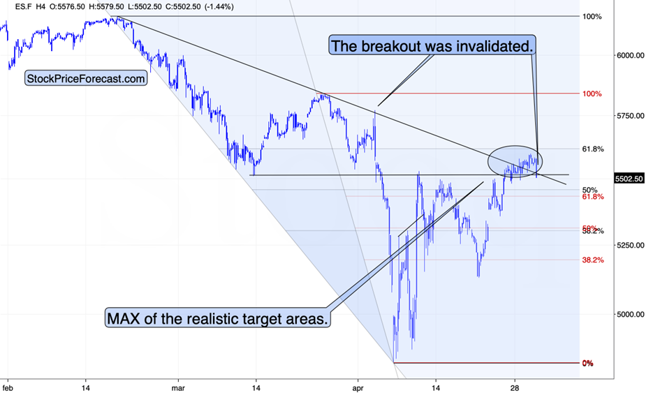 So far, the decline is relatively small (under 2%), but the important detail is that the S&P 500 futures moved back below their declining resistance line as well as the mid-March lows. This invalidation serves as a sell signal, and an indication that the corrective rally is over.