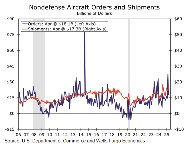 Durable goods orders fell 6.3% in April amid a drop in civilian aircraft orders (chart). Coming on the heels of a 158% surge in aircraft orders the prior month and amid fairly soft orders data from Boeing, we had been expecting a larger decline than the 51% drop in aircraft that was revealed in today's report (chart).