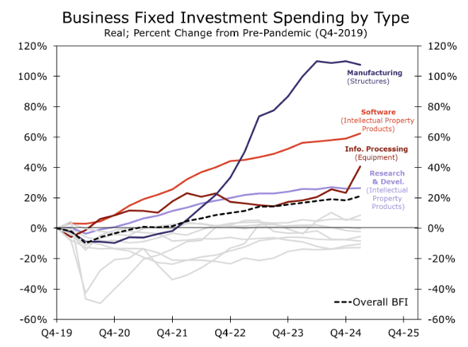 Despite choppy and broadly negative orders data, equipment spending was actually solid in the first quarter, marking the fastest quarterly pick-up in 14 years outside a one-quarter post-pandemic pop in Q3-2020. But most of the strength stemmed from the fastest quarterly gain in information processing equipment on record, which suggests businesses likely pulled forward some demand ahead of tariffs.