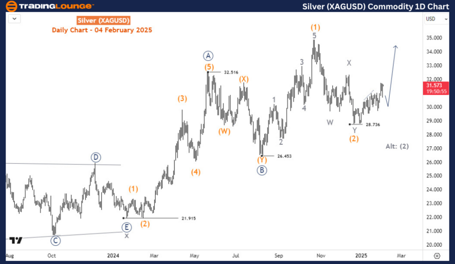 On the daily chart, the price is in wave ((C)) or ((3)). The sub-wave (1) of ((C))/((3)) has finished while wave (2) finished in December 2024 before the current resurgence started. From this low, we are counting wave (3) higher. While 28.7 holds, this wave count is valid. otherwise, a breach below 28.7 would mean wave (2) extending lower.