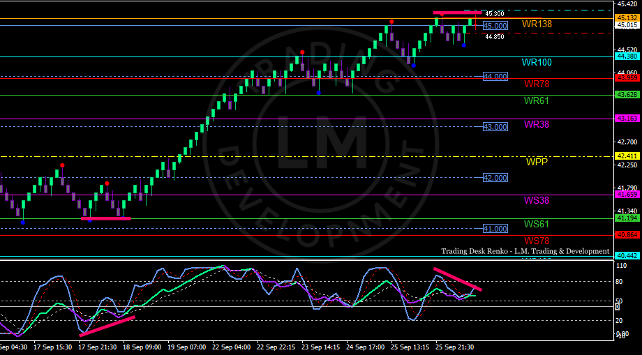 Silver shows key resistance at 45,15 $ with bearish stochastic divergence, while support is clustered near 44,80–45,00 $.