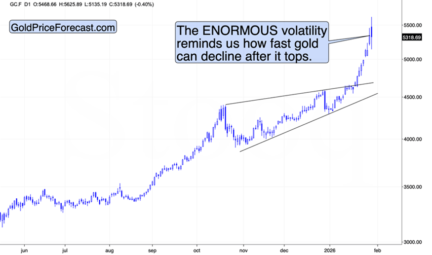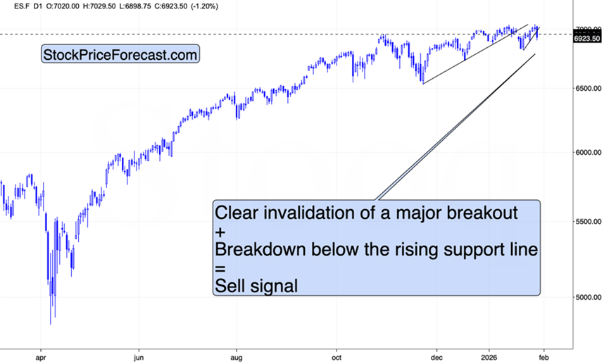 Stocks have once again failed to stay above their 2025 high, indicating that the rally could be over. This is yet another invalidation of this kind, but the size of today’s intraday decline in PMs suggests that this might be something different.