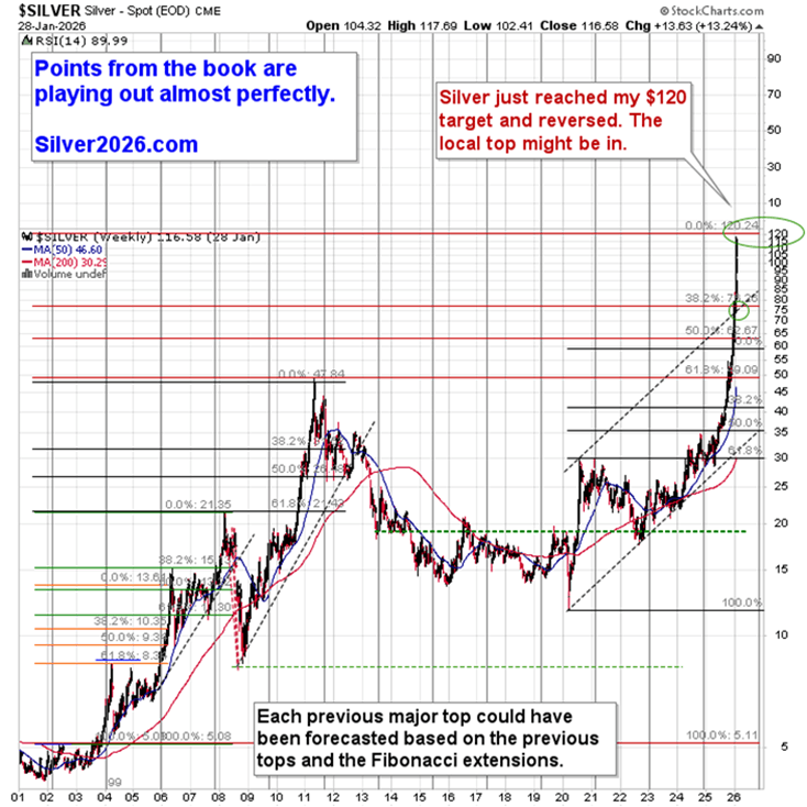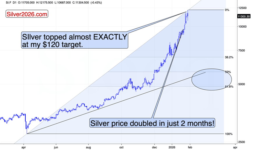 I’ve been writing about $120 target for silver for many months now. Most recently, on Monday. However, the first time I featured the above chart with $120 as the long-term target was literally years ago.