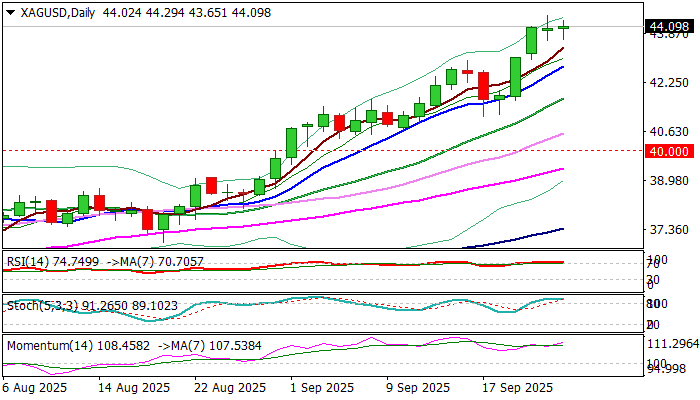 Silver price reduced pace after hitting new multi-year high ($44.46) on Tuesday but keeps firm bullish stance, lifted by recent rally in gold.