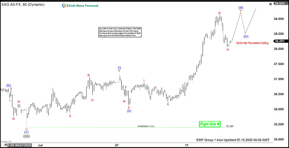 The cycle from the June 24, 2025 low in Silver (XAGUSD) is unfolding as a five-wave rally with an extended nested impulse structure. From the June 24 low, wave ((i)) peaked at $36.83. Wave ((ii)) pullback then followed o $35.39, as shown on the 1-hour chart. The metal then extended higher in wave ((iii)), subdivided as an impulse. From wave ((ii)), wave i ended at $36.61, with a wave ii pullback to $35.86. Wave iii reached $37.07 and wave iv corrected to $36.37. The final wave v concluded at $37.22, completing wave (i) in a higher degree.