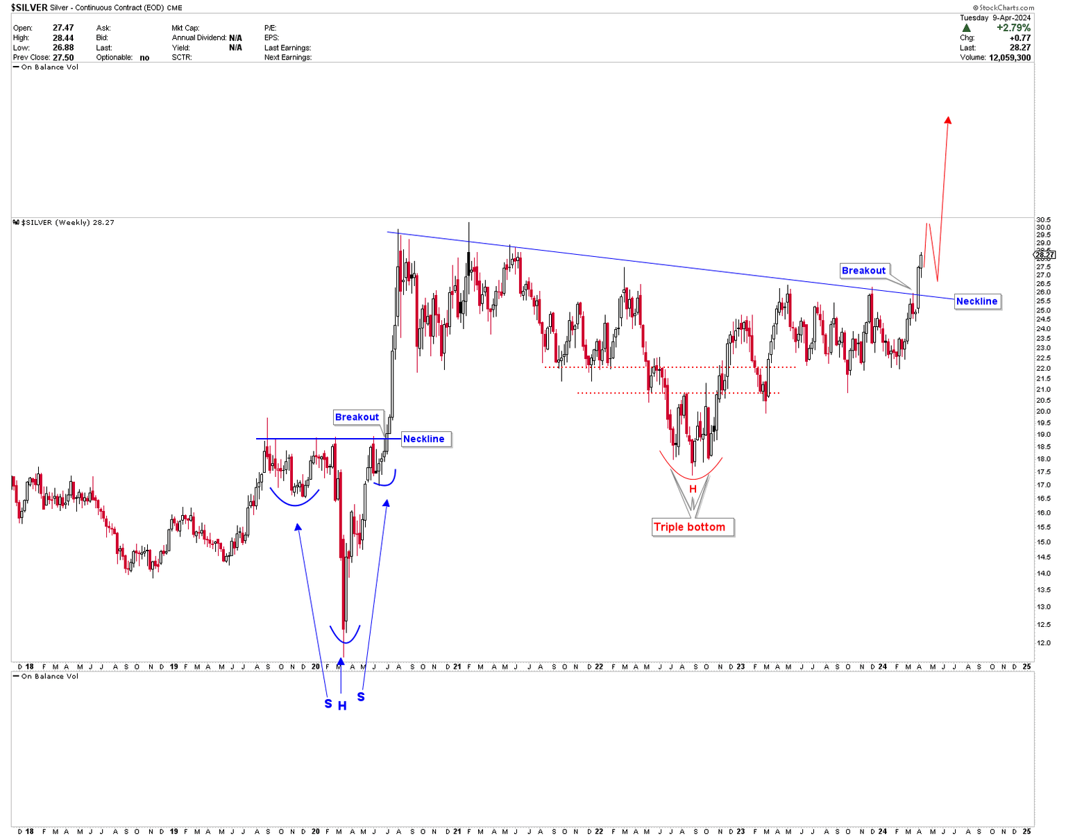 An examination of the weekly silver market chart below reveals a noteworthy development: breaking a long-term trend line following a triple bottom pattern. The significance of this move cannot be overstated, as it follows a fundamental pattern indicative of market confidence and the potential for a bullish future.