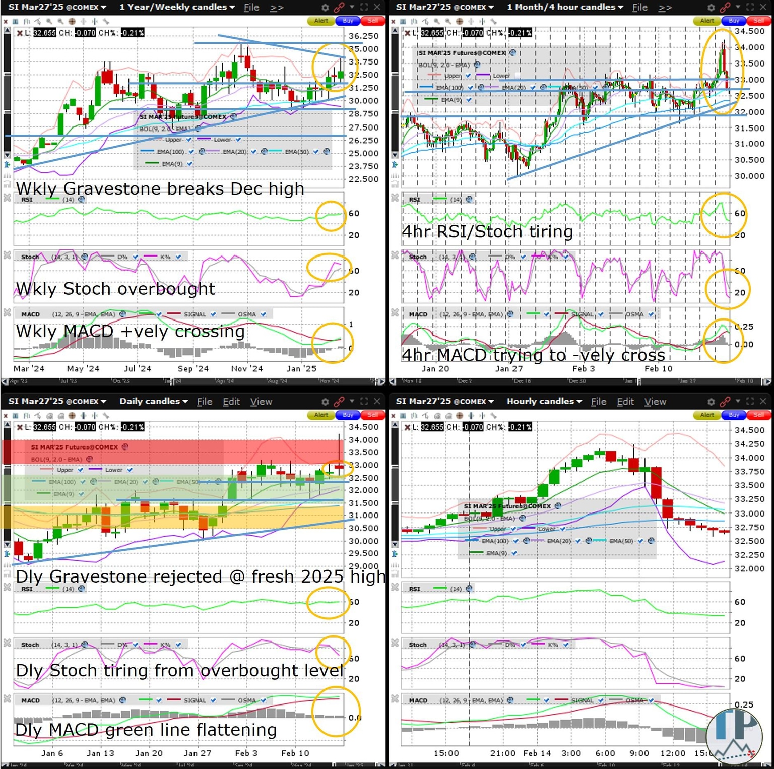 Silver (SI) edged nearly 1% lower Friday with its daily Gravestone getting rejected after forming a fresh 2025 high. The bigger picture is of SI digesting the strong January gains as seen in the February Doji forming as part of the advanced stages of a Bull Flag consolidation that began in November. Catalysts for further profittaking may arrive as early as Tuesday with Trump’s comments and Wednesday with the FOMC meeting minutes. Odds increase for firming by Thursday with the US unemployment claims and Friday with the US Flash manufacturing and services PMI. The bottomish or consolidating weekly RSI, Stochastics and MACD are weighed on by the tiring from overbought level weekly Stochastics. I am looking to enter long in the green zone (of the daily chart), targeting the red zone for Friday. The amber/yellow zone is where I might place a stop if I was a swing trader (although in my personal account with which I seldom hold overnight I sometimes set my stops tighter).