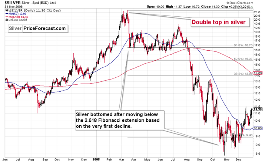 Silver’s 2008 top was also a double top. The second high was slightly above the first one.