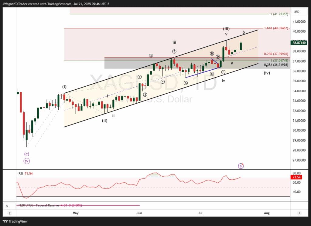 Silver remains bullish inside a well-defined rising channel. A corrective wave (iv) to $36–$38 is likely before wave (v) resumes. If Silver pushes above $39.70, then wave (v) may already be unfolding. Once wave (v) begins, a target near $42 is anticipated.