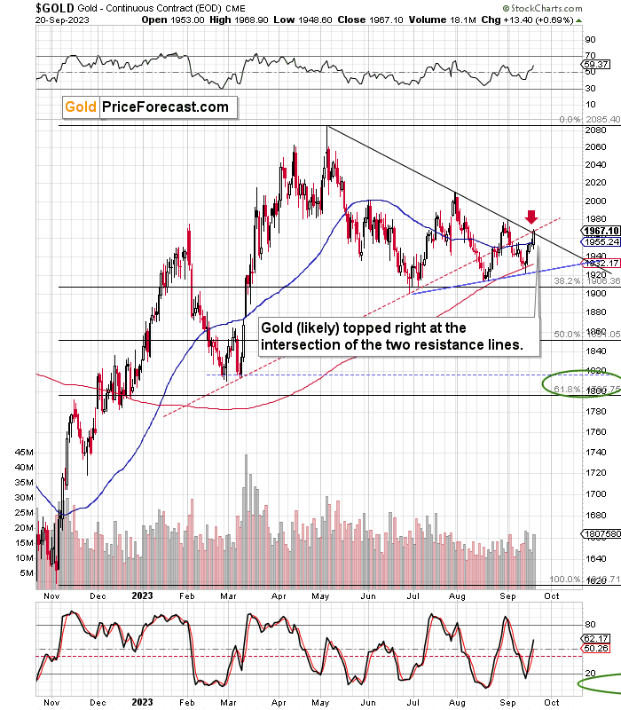 On the chart below, it’s clearly visible that gold did indeed move to the above-mentioned combination of resistance levels.