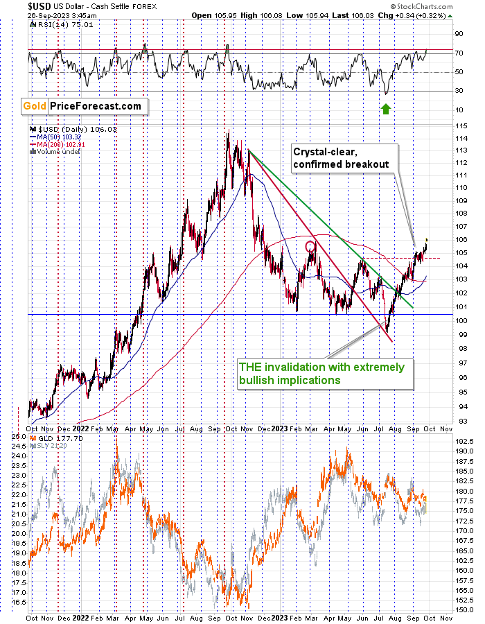 Now, given that the USD Index just closed above its previous 2023 high, it could be the case that it has some more rallying to do before it corrects. After all, breakouts to new yearly highs are easily noticeable by everyone, and it’s easy to see people getting excited (and bullish) by this development.