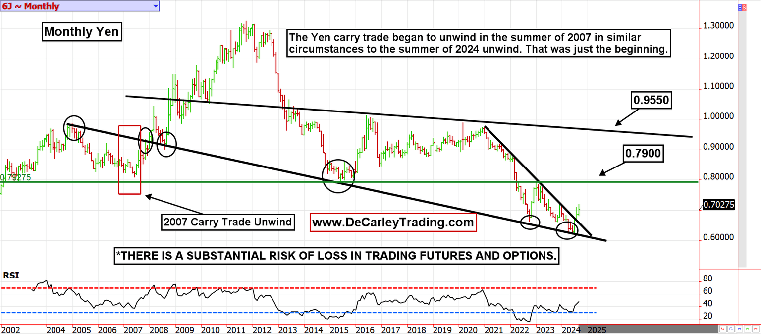 • The most obvious comparison is the unwinding of the yen carry trade, which lit the fire for the financial crisis fire in 2007. The equity market corrected immediately but never fully recovered its uptrend and eventually experienced a 50% correction. We are currently in the 2nd or 3rd inning of the game, so we don't yet know if this is a replay.